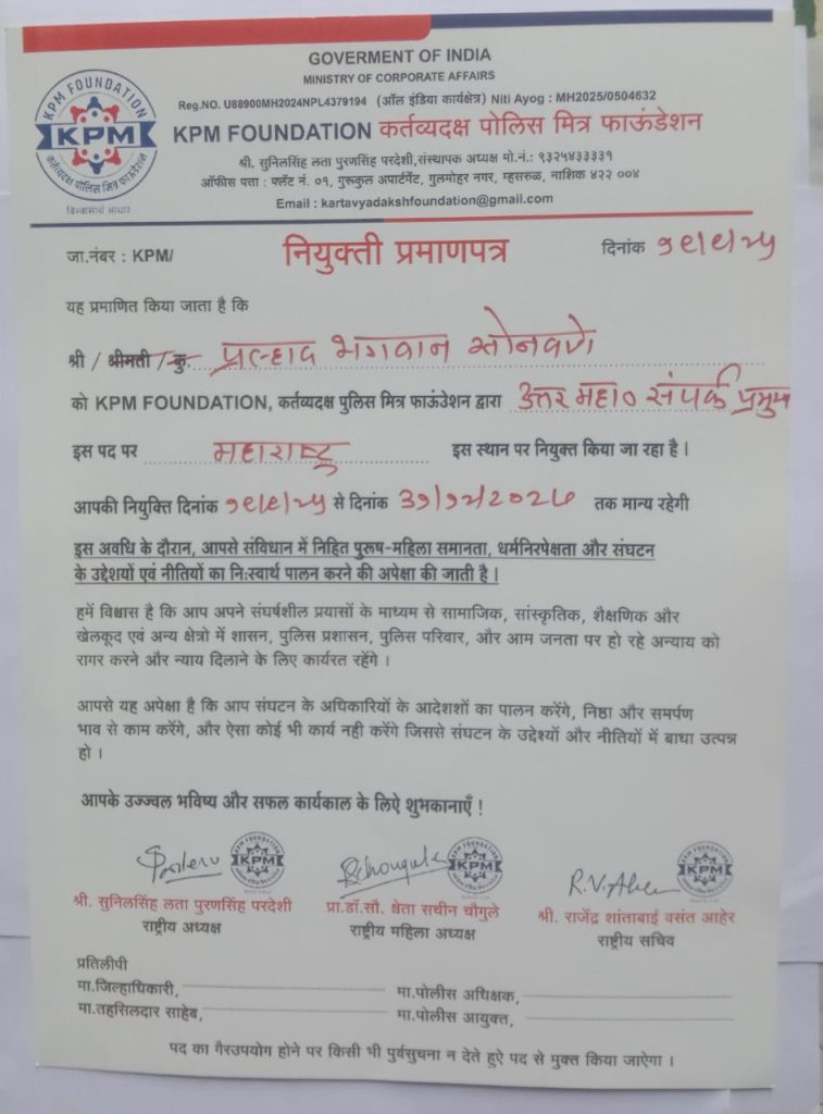 कर्तव्यदक्ष पोलिस मित्र फाउंडेशनच्या उत्तर महाराष्ट्र विभाग संपर्क प्रमुख पदी प्रल्हाद सोनवणे यांची नियुक्ती !