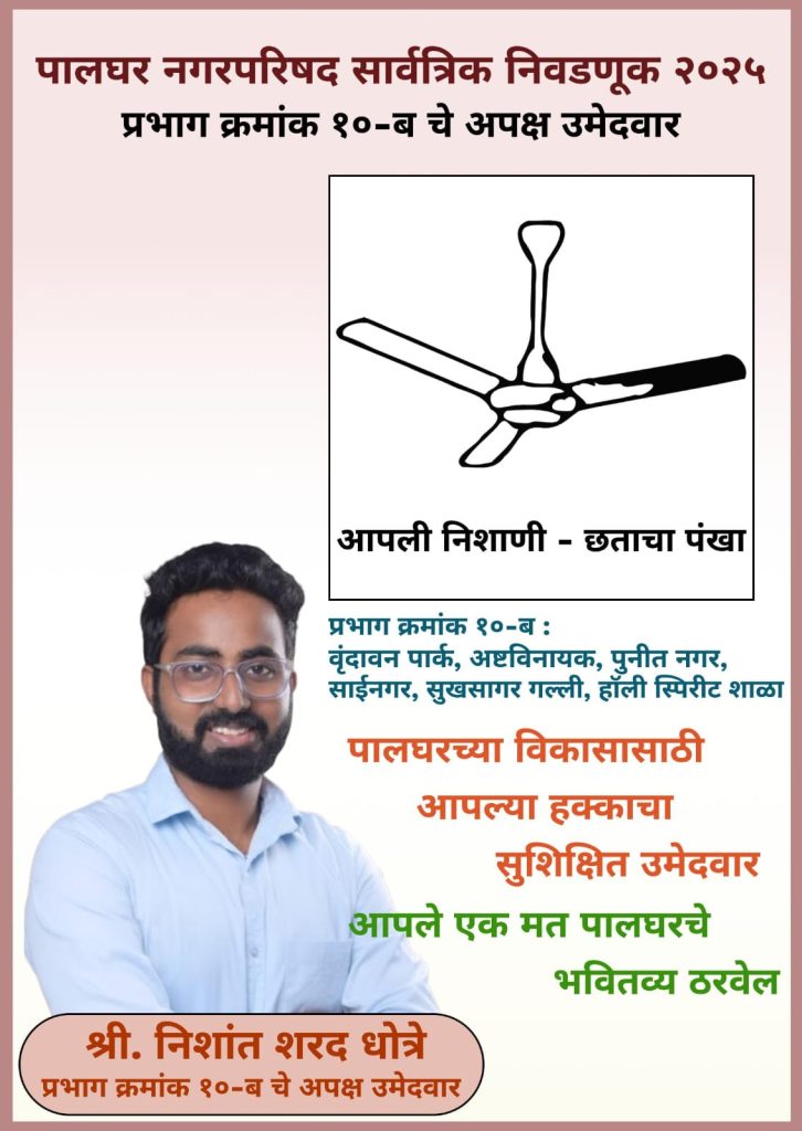 पालघर (प्रतिनिधी)पालघर नगरपरिषद निवडणुकीत नगरसेवक पदासाठी अपक्ष उमेदवार म्हणून निशांत धोत्रे यांनी आपली उमेदवारी जाहीर केली असून त्यांच्या प्रचाराला चांगलीच गती मिळाल्याचे चित्र दिसत आहे.