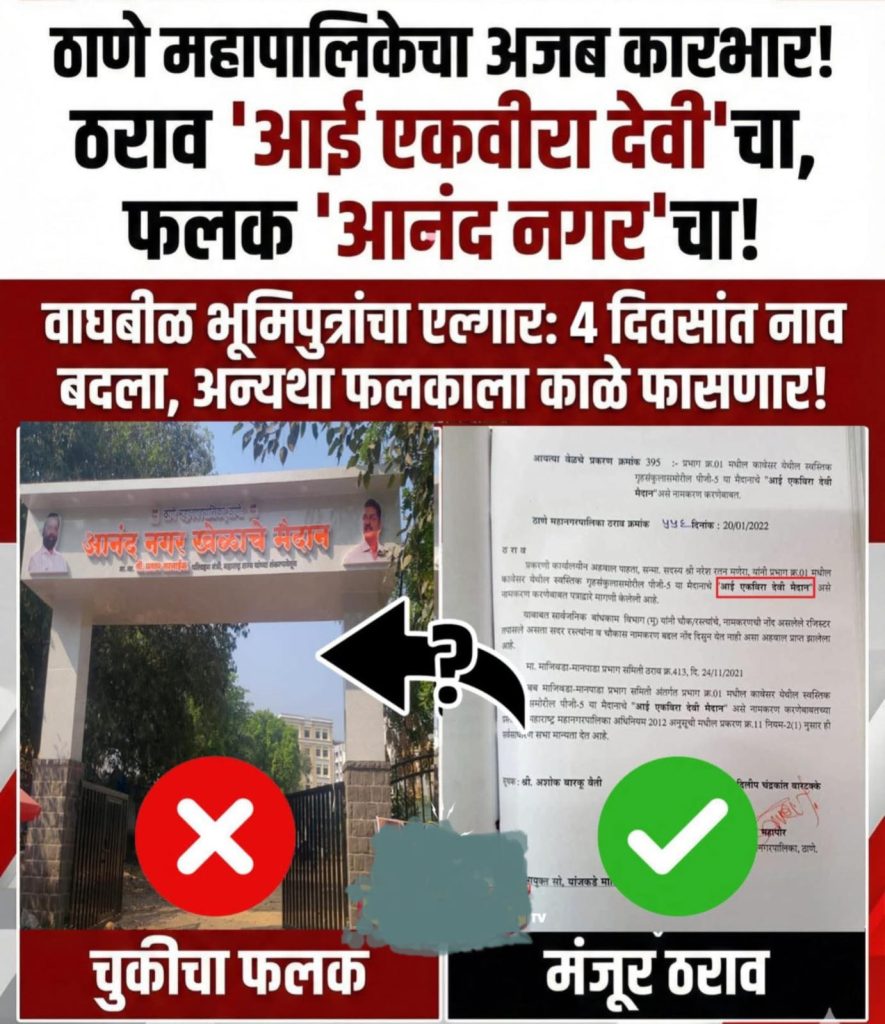 ठाणे महापालिककेचा अजब कारभार! ठराव “आई एकवीरा देवी” चा “फलक आनंद नगर” चा!