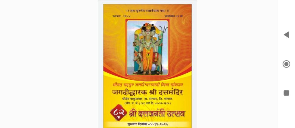 सफाळे ( एच लोखंंडे ) दिनांक ४ डिसेंबर २०२५ रोजी, श्रीमद् सद्गुरू जगदिश्वर स्वामी शिष्य संप्रदाय यांच्या कडून सालाबादप्रमाणे, जगदोध्दारक श्री दत्तमंदिर, श्रीक्षेत्र माकुणसार ता. जि.पालघरया ठिकणी “श्री दत्त जन्मोत्सव” मार्गशीर्ष शुद्ध १५ शके १९४७ – गुरूवार रोजी. मंदिराचे अध्यक्ष – श्री. प्रमोद ज.ठाकुर , चिटणीस – श्री.नितीन हे. राऊत आणि विश्वस्त मंडळ यांच्या सहयोगाने व संप्रदाय प्रसारक श्री.नारायण मंगळ्या पाटील – भजन / किर्तन व्यवस्थापक आणि ह.भ.प.श्री. विजयबुवा दळवी – पालघर, श्री.जगन्नाथ केशव ठाकूर, श्री.पिटाळे सर किर्तनकार सफाळे, श्री.रामदास जाधव तसेच श्रीमत् सद्गुरू जगदोध्दारक स्वामी शिष्य संप्रदाय यांच्या संयुक्त विद्यमाने वरील कार्यक्रम आयोजित करून यशस्वीपणे संपन्न करण्यात आला आहे.
