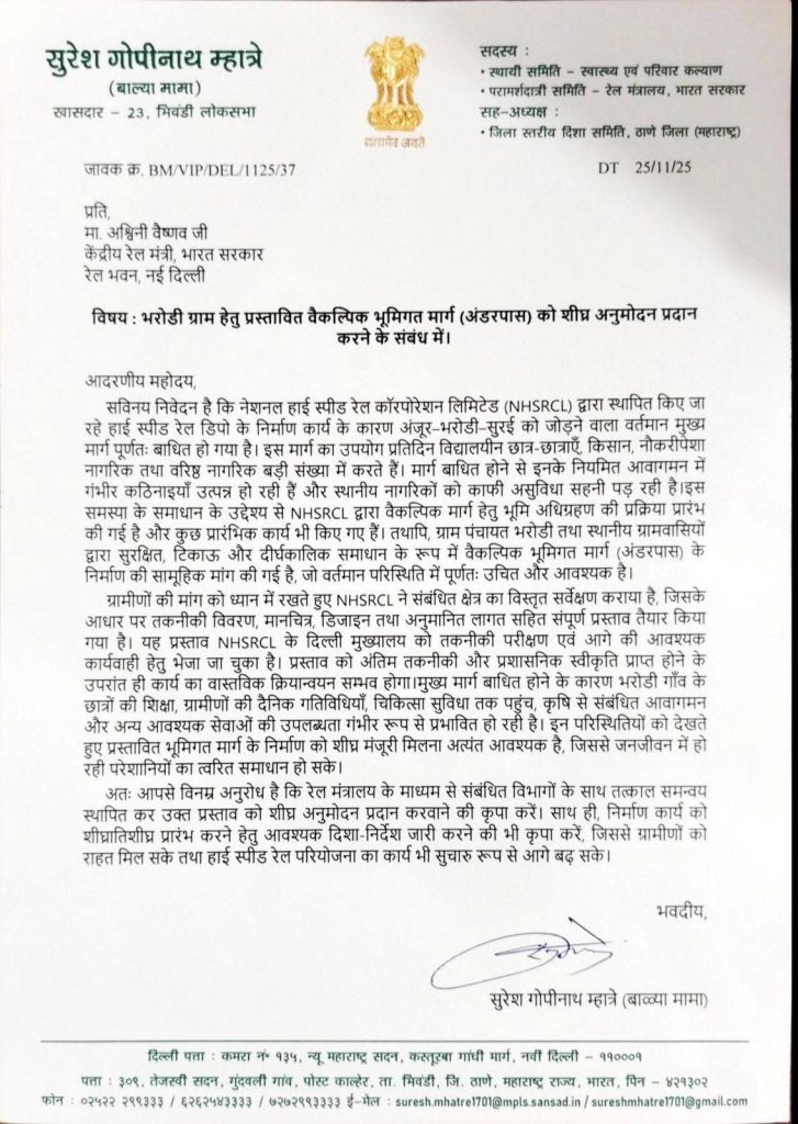 देशाचे पंतप्रधान नरेंद्र मोदी यांचा ड्रीम प्रोजेक्ट बुलेट ट्रेन प्रकल्प मुंब्रा देसई मार्गे भिवंडी तालुक्यातील भरोडी गावात कार शेड चे नियोजन करण्यात आले आहे.कार शेड मुळे गावातील सुरई फाटा अंजूर रस्ता पूर्णपणे बंद होणार आहे.शालेय विद्यार्थ्यांना अंजूर हायस्कूल येथे येण्यासाठी वेहेले गावातून यावं लागेल. विद्यार्थ्यांना व नागरिकांना ५ मी प्रवासासाठी १ तासाचा प्रवास करावा लागेल. गावातील सांड पाण्याचा निचरा होणार नाही. संपूर्ण गावाला नाहक त्रास होणार आहे.