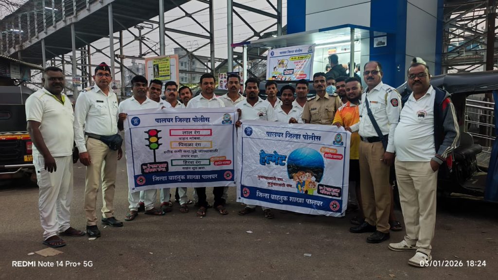 सफाळे ( एच लोखंंडे ) ३७ व्या रस्ता सुरक्षा अभियान २०२६ अंतर्गत मा.श्री. यतिन देशमुख पालघर जि. पोलीस अधिक्षक यांच्या मार्गदर्शनाखाली व श्री. सुरेश साळुंखे – वाहतूक शाखा प्रभारी अधिकारी यांच्या मार्गदर्शनाखाली दिनांक ३ जानेवारी २०२६ रोजी सफाळे पुर्व ता.जि.पालघर रेल्वे रिक्षा स्टँडवर असलेल्या रिक्षा चालक, वाहक आणि मोटरसायकल धारकांना पालघर जिल्हा वाहतूक शाखेचे सफाळे येथे कार्यरत श्री. बाळासाहेब यमगार ASI आणि पोलिस अंमलदार श्री खेतले यांनी तिनं चाकी वाहन चालक, मोटरसायकल धारकांना, वाहतूक नियमांचे पालन करणे आणि स्वतःच्या व इतरांच्या सुरक्षिततेची काळजी घेणे आणि रस्ते अपघात कमी करणे हे सुरक्षा सप्ताहचा मुख्य उद्देश आहे,