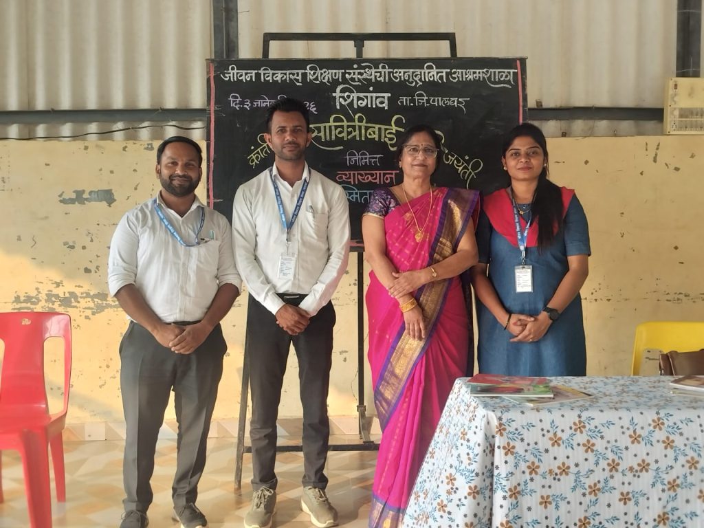 क्रांतीज्योती सावित्रीबाई फुले यांच्या जयंतीनिमित्त विद्यार्थ्यांना त्यांच्या थोर कार्याची व विचारांची माहिती देण्यासाठी जीवन विकास संस्थेची अनुदानित आश्रम शाळा, शिगाव येथे शनिवार दिनांक ०३ जानेवारी २०२६ रोजी विशेष व्याख्यानाचे आयोजन करण्यात आले होते. या कार्यक्रमासाठी श्रीमती डॉ. स्मिता सुधीर माळवदे या प्रमुख वक्त्या म्हणून उपस्थित होत्या.