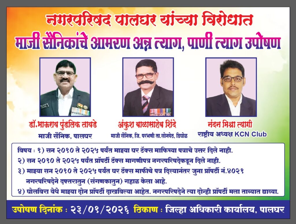 मी मागासवर्गीय व माजी सैनिक असूनही नगर परिषद पालघरकडून सातत्याने अन्याय व दिशाभूल केली जात आहे. या सर्व प्रकाराविरोधात न्याय मिळावा, यासाठी दिनांक २३ जानेवारी २०२६ रोजी दुपारी १२ वाजता जिल्हाधिकारी कार्यालय, मोरेकरुण रोड, पालघर येथे अन्नत्याग व पाणीत्याग अमर उपोषण करणार आहे.