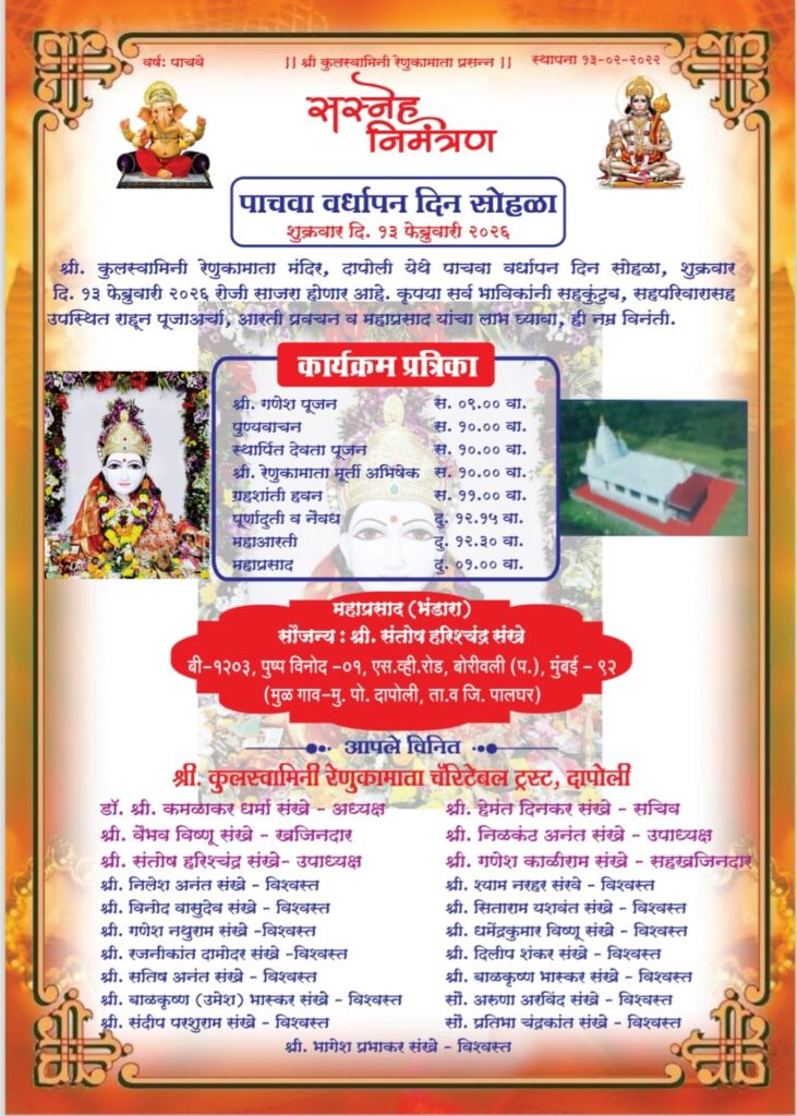 श्री कुलस्वामी रेणुका माता मंदिर, दापोली येथे पाचवा वर्धापन दिन सोहळा येत्या शुक्रवार, दिनांक 13 फेब्रुवारी 2026 रोजी मोठ्या उत्साहात साजरा करण्यात येणार आहे.