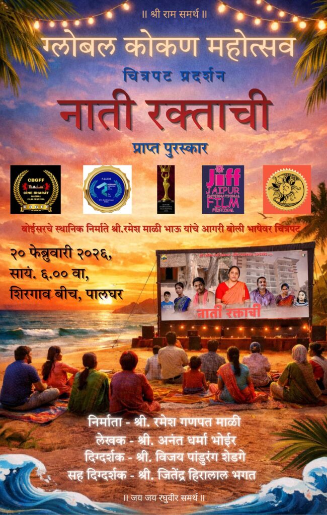 नात्यांची ऊब, कोकणाचा सुगंध आणि सागराच्या साक्षीने एक खास संध्याकाळ अनुभवण्याची संधी पालघरकरांना आज मिळणार आहे. ग्लोबल कोकण महोत्सवाच्या निमित्ताने मराठी चित्रपट ‘नाती रक्ताची’ याचे विशेष प्रदर्शन आज, दि. २० फेब्रुवारी २०२६ रोजी सायं. ६.०० वाजता शिरगाव बीच, पालघर येथे आयोजित करण्यात आले आहे.