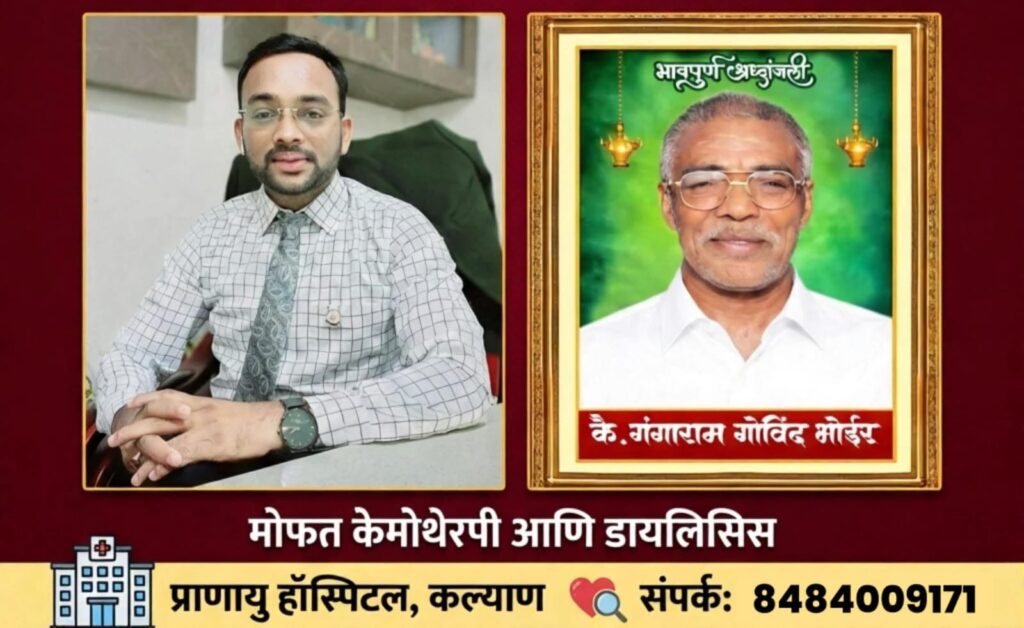 डॉ. राजेश भोईर यांचे वडील कै. गंगाराम गोविंद भोईर यांचे नुकतेच (शुक्रवार, दि. १३/०२/२०२६) दुःखद निधन झाले. वडिलांच्या जाण्याने भोईर कुटुंबावर दुःखाची लाट पसरली. मात्र, वडिलांनी दिलेल्या संस्कारांची शिदोरी जपत, डॉ. राजेश यांनी एक महत्त्वपूर्ण निर्णय घेतला. वडिलांच्या पवित्र स्मृतीप्रित्यर्थ ‘प्राणायु हॉस्पिटल’मध्ये पुढील तीन महिने केमोथेरपी आणि डायलिसिसचे उपचार पूर्णपणे मोफत देण्याचे त्यांनी जाहीर केले आहे. ज्या उपचारांचा खर्च सर्वसामान्यांना परवडत नाही, ते उपचार मोफत करून त्यांनी शेकडो रुग्णांना मोठा दिलासा दिला आहे.