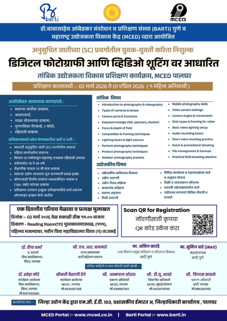 अधिक माहिती श्री.डी.सी. थोरात मो.नं. 9168667163 ,श्रीमती वैशाली ढेपे, मो.नं 99202 67328 व श्री.सचिन माळवे मो.न 8693014527 एम.सी.ई.डी. पालघर, श्रीमती स्नेहा मोरे , विवा कॉलेज, विरार मो. नं.9167540584 यांच्याशी संपर्क साधावा किंवा एमसीडीच्या वेबसाईट www.mced.co.in/Barti या link वर जाऊन ऑनलाईन नोंदणी करावी असे आवाहन श्री. डी.यू. थावरे, विभागीय अधिकारी महाराष्ट्र उद्योजकता विकास केंद्र, मुंबई आणि श्री. विलास साबळे प्रकल्प अधिकारी, बार्टी पालघर यांनी केले आहे.