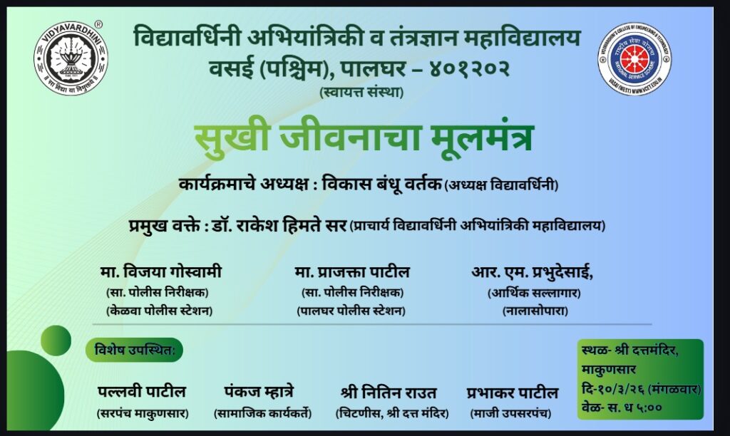 सफाळे ( एच लोखंंडे ) दिनांक १० मार्च २०२६ रोजी श्री. दत्तमंदिर सभागृह माकुणसार येथे. विद्यावर्धिनी अभियांत्रिकी व तंत्रज्ञान विद्यालय ( स्वयंत्त संस्था ) यांच्या कडून आयोजित करून यशस्वीपणे संपन्न करण्यात आला.
