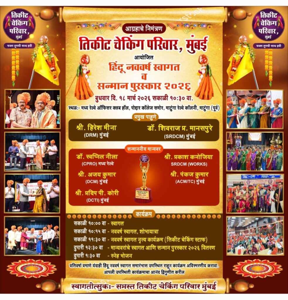 मुंबई :(प्रतिनिधी )तिकीट चेकिंग परिवार, मुंबई यांच्या वतीने हिंदू नववर्षाच्या स्वागतानिमित्त भव्य कार्यक्रम तसेच “सन्मान पुरस्कार २०२६” सोहळ्याचे आयोजन करण्यात आले आहे. हा कार्यक्रम बुधवार, दिनांक १८ मार्च २०२६ रोजी सकाळी ९.३० वाजता आयोजित करण्यात येणार आहे.
