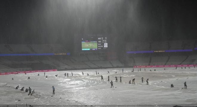 ३.४ षटकांत कोलकाताची धावसंख्या २५/२ अशी असताना अचानक पावसाने जोर धरला. मैदान तातडीने झाकण्यात आले. बराच वेळ प्रतीक्षा करण्यात आली, पण आउटफिल्ड पूर्णपणे ओलसर राहिल्याने अखेरीस सामना रद्द करण्याचा निर्णय घ्यावा लागला. केवळ २२ चेंडूंचा खेळ होऊन सामना निकालाशिवाय संपला, ही या हंगामातील पहिली मोठी हवामानजन्य अडचण ठरली.